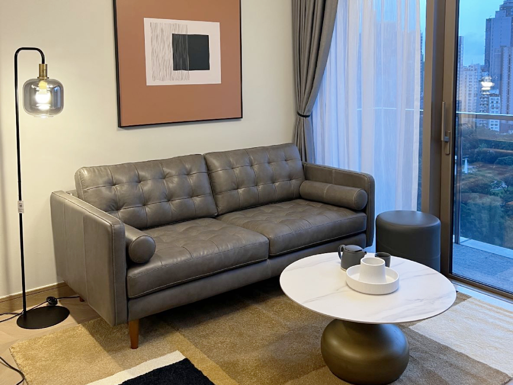 透過at.home復古皮革款式的意大利全真皮梳化,特設獨特圓筒形抱枕,配襯輕奢風茶几,凸顯半山豪宅享受。