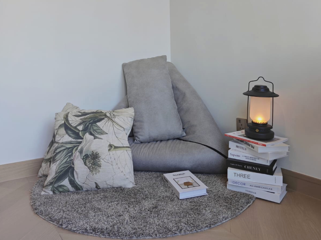 單位其中一間房間特別佈置成書房用途,角落用上寵物布懶人梳化,化身寫意休閒小角落。