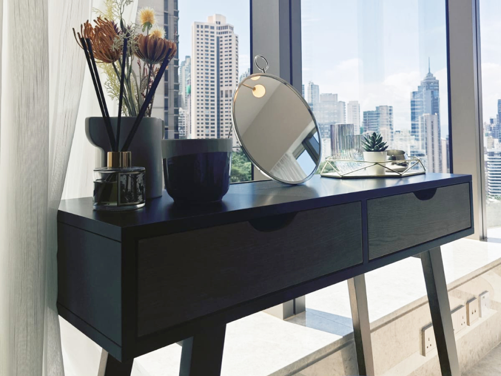 單人睡房加入小書檯及掛牆鏡,變身成化妝檯用途。
