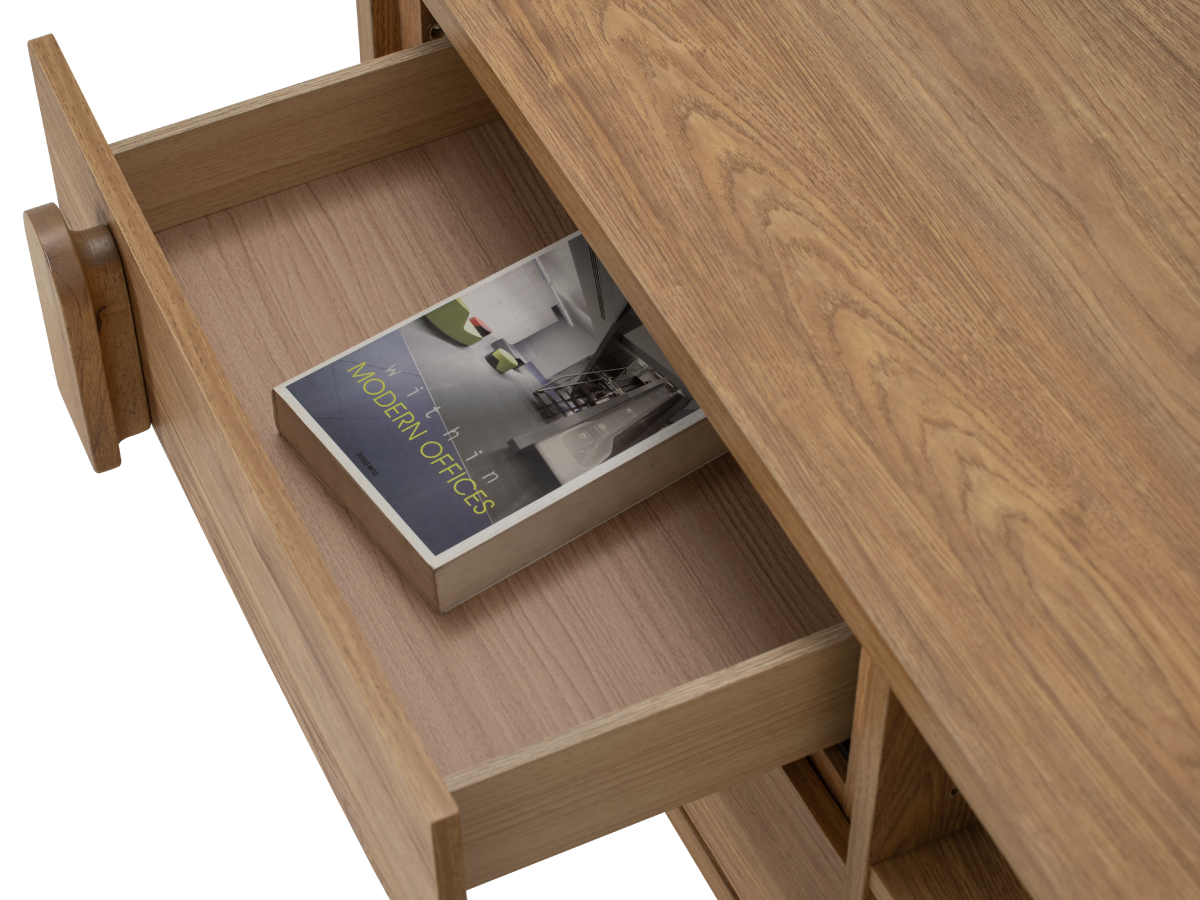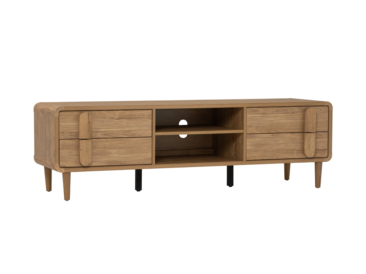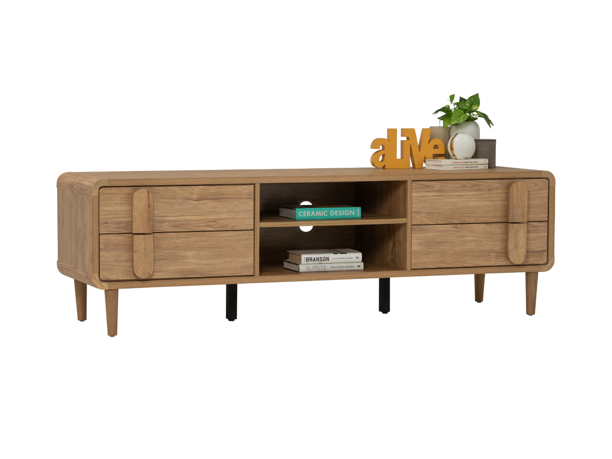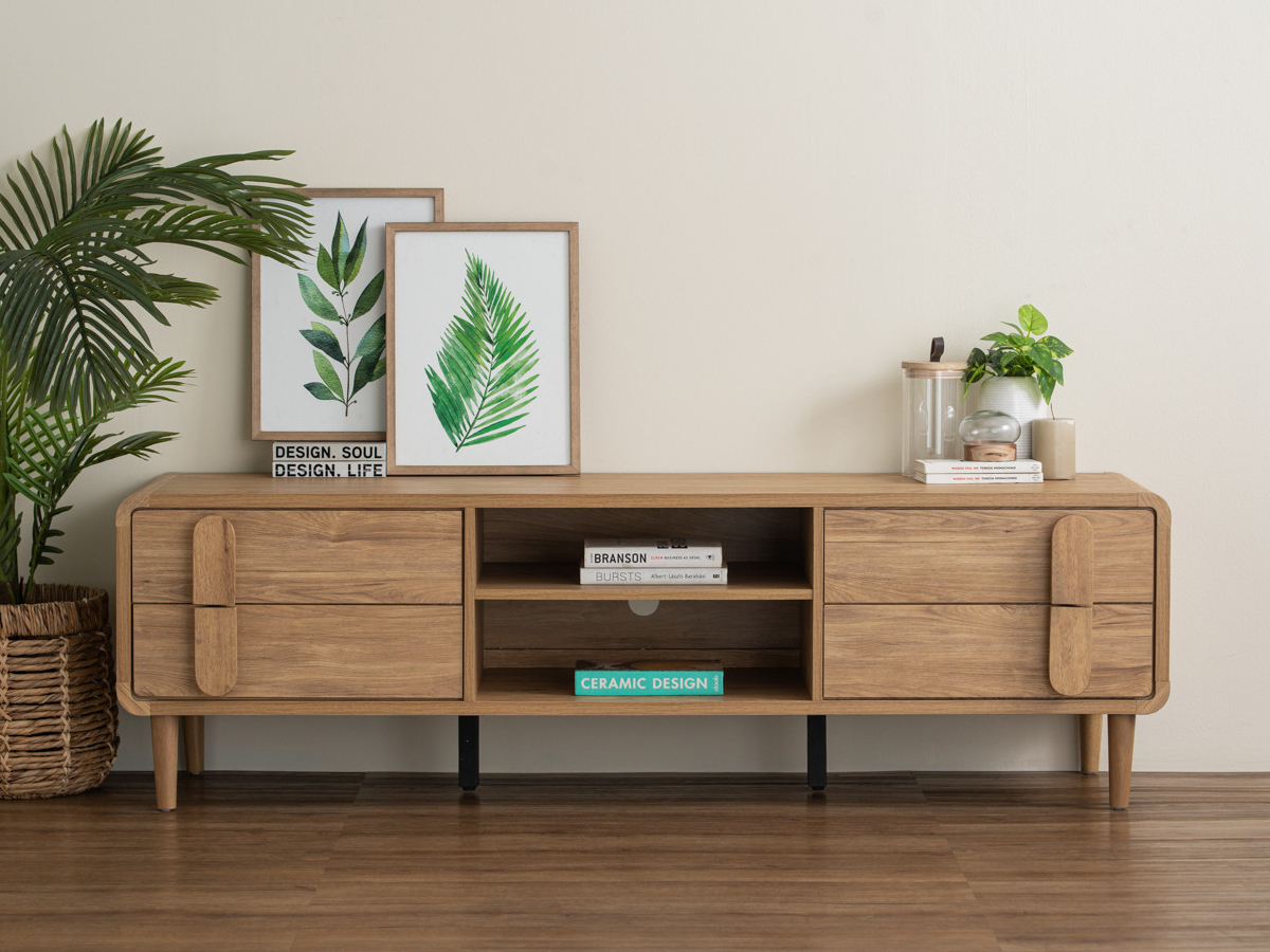 北歐風電視櫃注重線條、自然木紋,讓客廳兼具溫馨與實用性。來自馬來西亞的LOME系列傢俬,自然原木色北歐風款式,特色細緻木紋呈現天然質感,系列標誌性設計是流線型設計造型,配備獨特圓弧立體把手,簡潔而不失優雅。長度165厘米的LOME電視櫃,左右各設兩組抽屜,立體手柄設計,簡單拉開,可以整齊及方便收納更多物品;電視櫃中間設兩層式的開放式層架收納空間,活動式層式可供自己調節收納空間大小,背面設有穿線孔,方便穿電線,方便整理及隱藏電視機、喇叭等不同裝置電線。